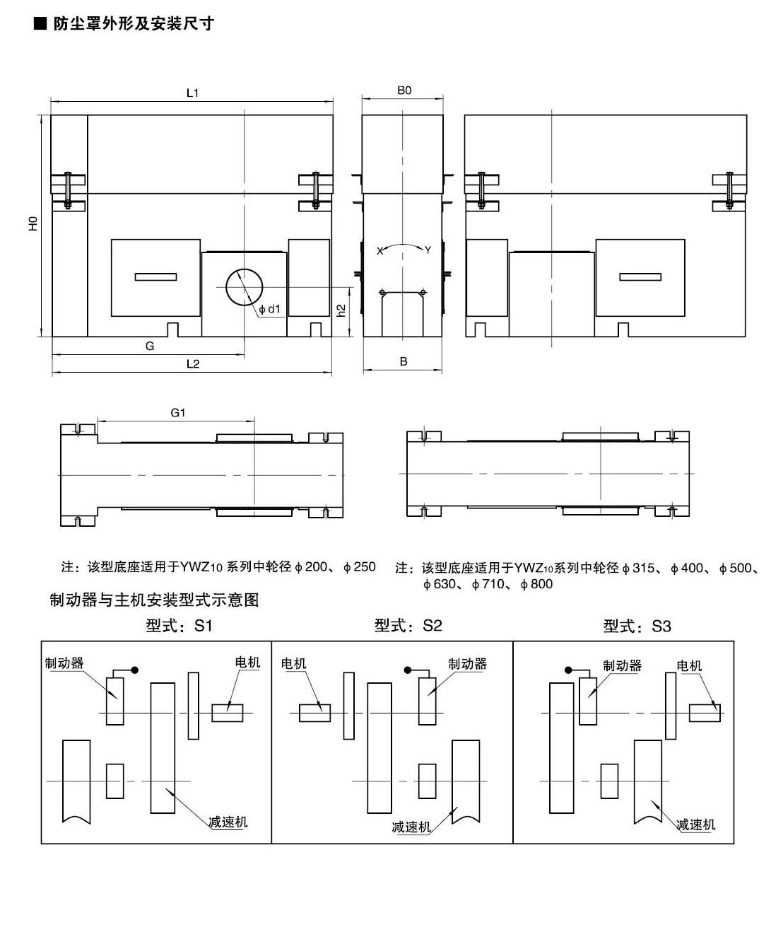 YWZ10,YWZ12系列電力液壓鼓式制動器的連接尺寸和制動力矩參數(shù)符合GB6333-86標準,技術要求符合JB / T6406-2006標準,配套符合DIN15430標準的Ed系列推動器。
