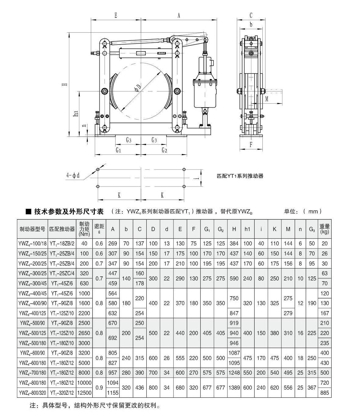 YWZ(YT1)系列電力液壓鼓式制動器的連接尺寸和制動力矩參數(shù)符合JB/ZQ4388-86標準,技術要求符合JB / T6406-2006標準。
